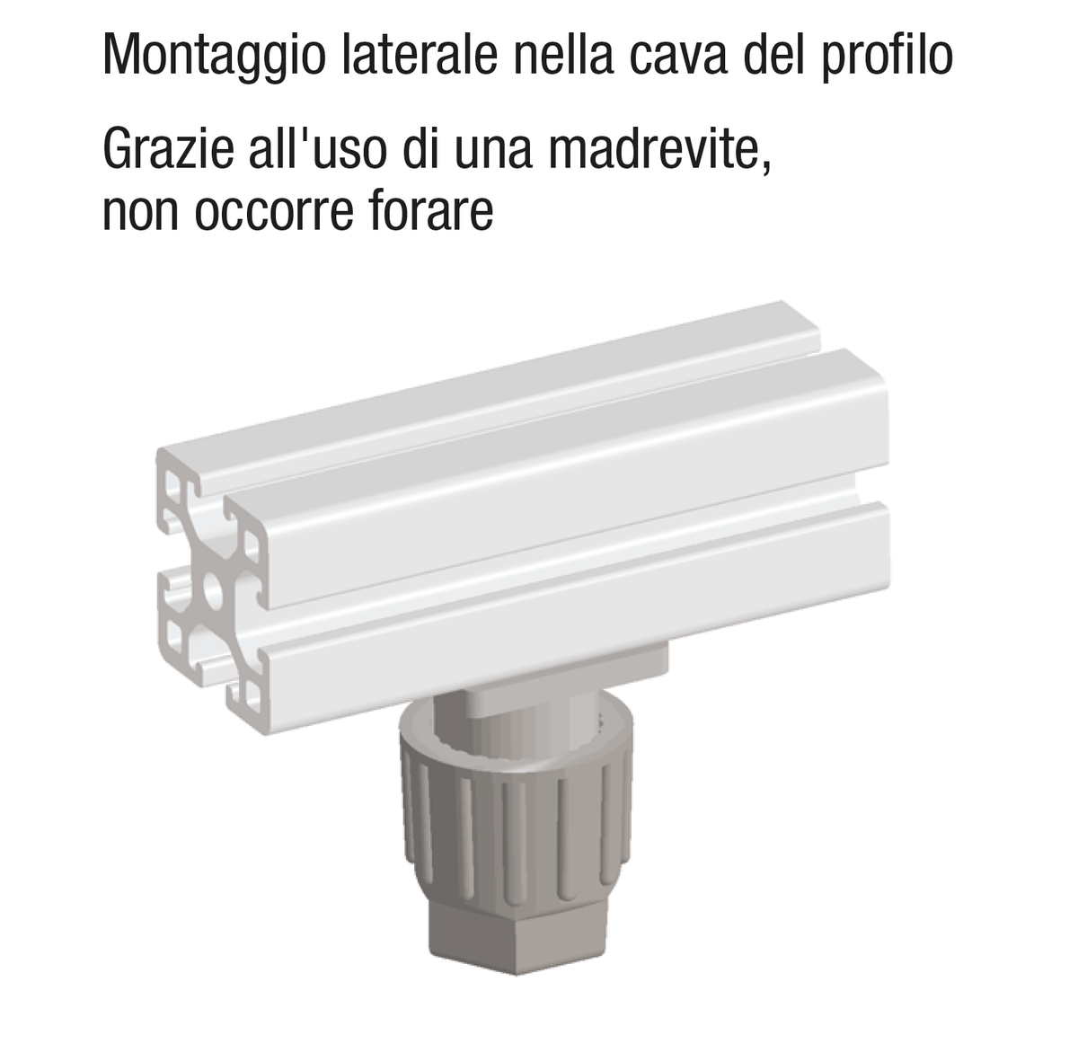 I piedini sono particolarmente adatti per tavoli e allestimenti leggeri. L'altezza dei piedini può essere regolata girando in continuo le viti, a mano o con un utensile. I puntali del pezzo terminale consentono il centraggio e/o il posizionamento antitorsione del piedino. I piedini possono essere fissati con l'ausilio di un tassello, senza bisogno di forare i profili di alluminio.