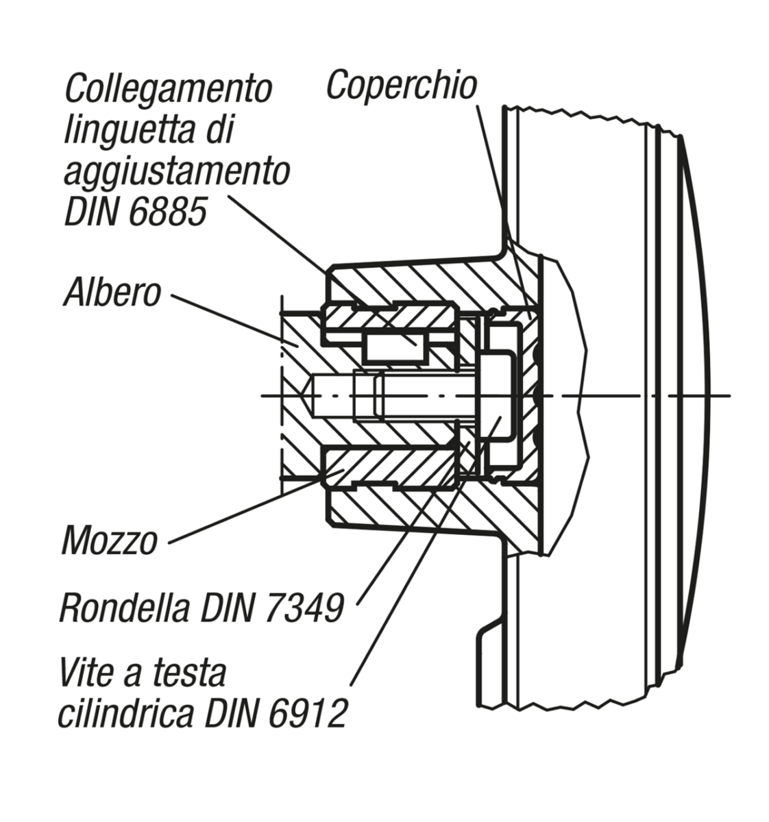 I volantini possono essere fissati all'albero in senso assiale mediante un collegamento con spina trasversale o con una vite a testa cilindrica DIN 6912 e una rondella DIN 7349.