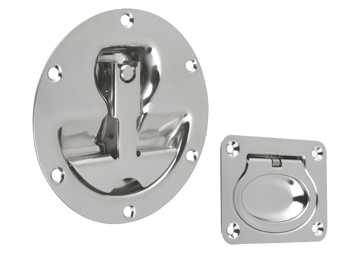 Maniglie a cerniera in acciaio inox con profondità di montaggio ridotta. Per piastre di base e di montaggio o cassetti. Con molla di ritorno. Dopo l'azionamento, la maniglia torna automaticamente in posizione di riposo.